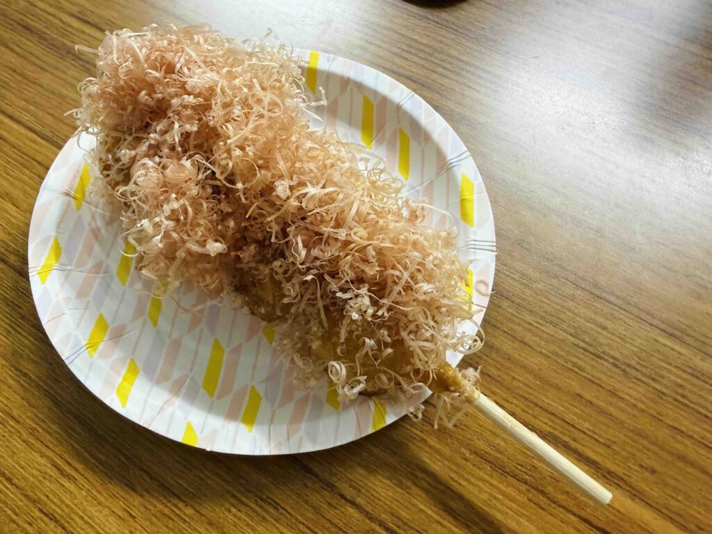 にんべんさんのかつおだしを使用したみたらし団子に、糸切りの鰹節(団子の食感に合うようにと、特注なのだそう)がたっぷり!!