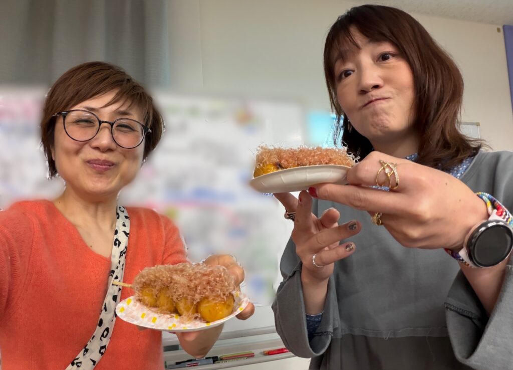 長時間に渡る研修の合間に、支援先のご担当者が美味しいおやつを準備して下さいました。