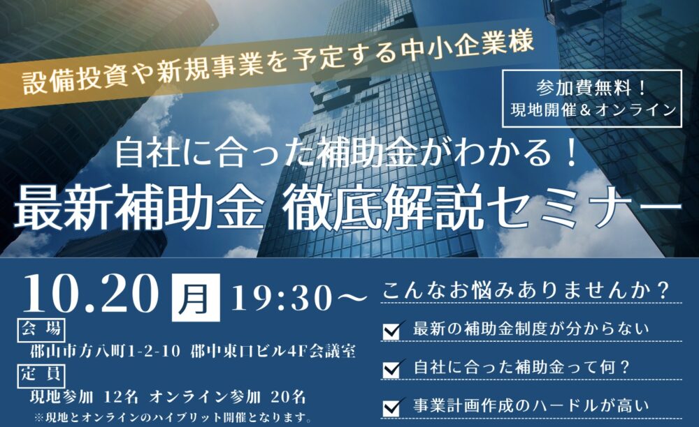 NEWS お知らせ HOME お知らせ 2025.09.20 (株)B-nO Consultingは6周年を迎えました 2025.09.19 【10/20(月)19時半~リアル&オンライン開催】「自社に合った補助金がわかる!最新補助金 徹底解説セミナー」(参加費無料)申し込み〆切〜10/17金曜まで 2025.09.16 【10/16(木)20時〜オンラインイベント開催】組織のウェルビーイング創造MTG(参加費無料)