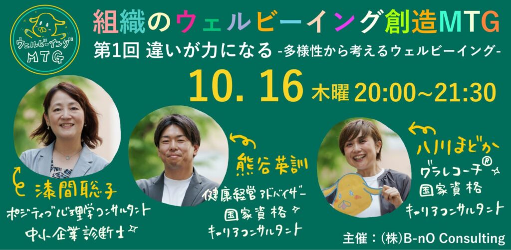 そして、第1回目となる10月16日開催の組織のウェルビーイング創造MTGは、「違いが力になる —多様性から考えるウェルビーイング」と題し、ご自身の職場や経験などに照らし合わせながら「多様性を力に変える」ヒントを探していきます。