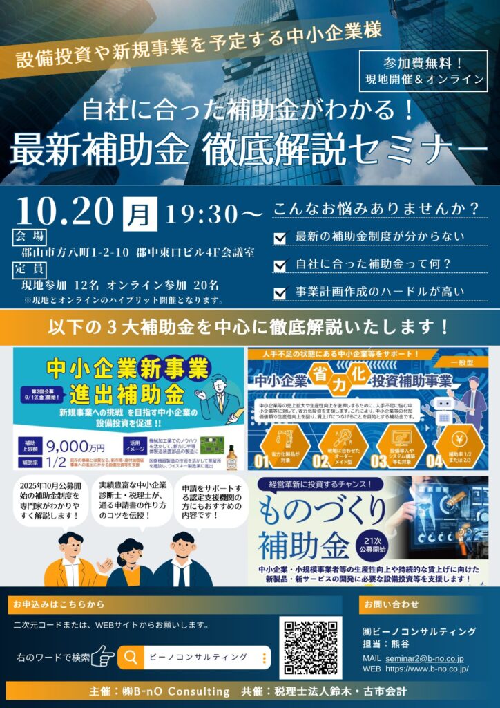 (株)B-nO Consultingでは、10月20日月曜19時半より、「自社に合った補助金がわかる!最新補助金 徹底解説セミナー」を、リアル(福島県・郡山市)とオンラインのハイブリットで開催します。(申し込み〆切〜10/17金曜まで)